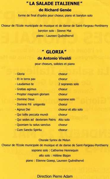 Au programme la "Salade Italienne", donnée par la Chorale de l'Ecole de Musique et de Danse de Saint-Fargeau-Ponthierry, et le "Gloria de Vivaldi", donné par les deux chorales réunies.